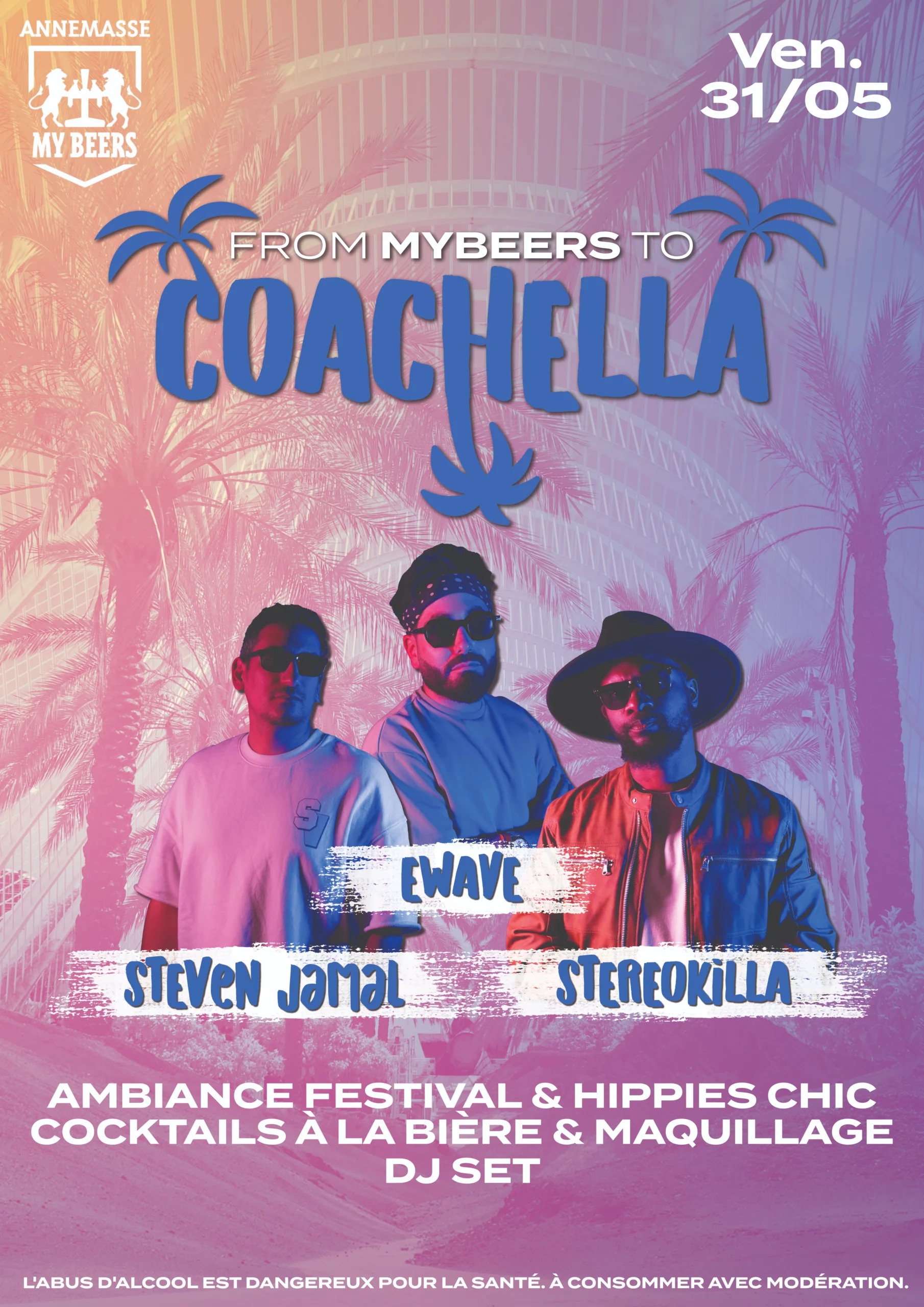 Cette affiche a été réalisée pour faire la promotion d’une soirée « boiler room » Coachella. L’affiche devait avoir une ambiance estivale et on devait voir les trois DJ avec leurs noms, ainsi que la mention « l’abus d’alcool est dangereux pour la santé ».