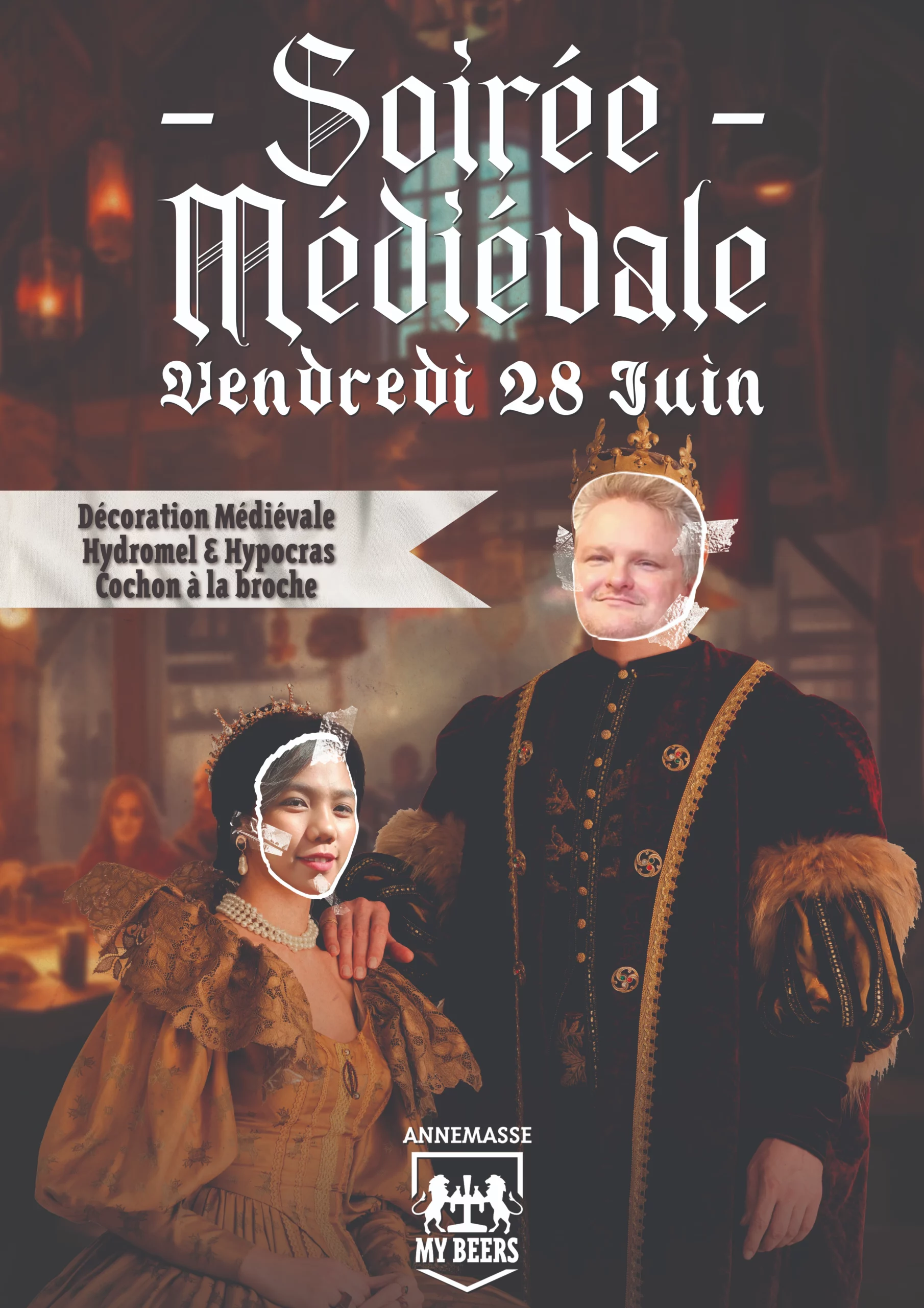 Cette affiche a été réalisée pour faire la promotion d’une soirée médiévale. Le client souhaitait qu’on aperçoive un roi et une reine du temps du Moyen Âge. J’ai ensuite réalisé le visuel, et décidé de créer un côté décalé, pour rappeler l’ambiance du bar, en rajoutant la tête des dirigeants du bar.